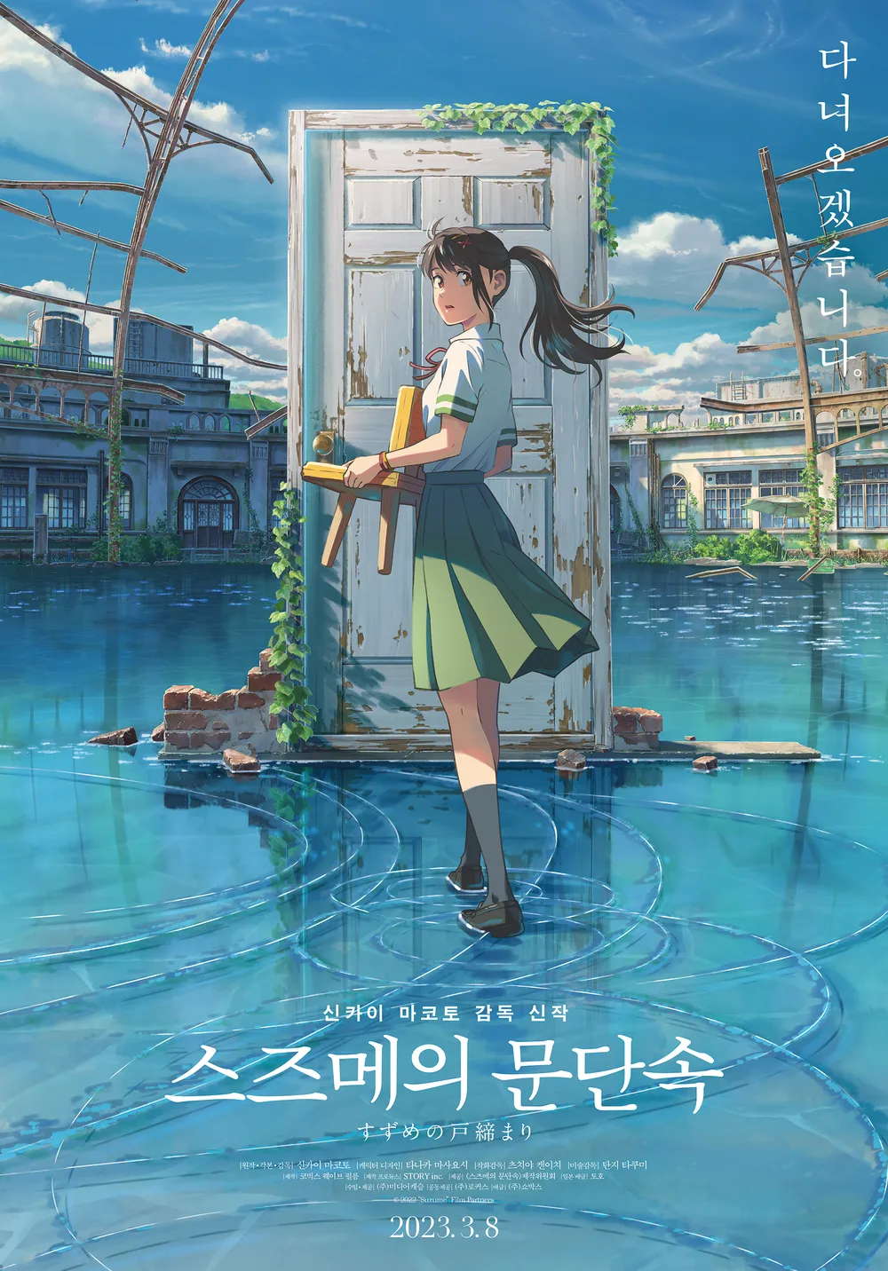 2022년 11월11일에 일본에서 개봉한 신카이 마코토 감독의 애니메이션 영화로 국내에서는 2023년 3월8일 개봉되었습니다. 개봉일을 11월11일로 정한것은 동일본 대지진 발생일이 11일이었다는 점을 강조하며 정한것이라고 합니다. 우리 나라를 포함한 외국의 개봉날짜를 3월로 통일한것도 지진 발생월이 3월이였기 때문이라고 합니다. 일본 각자의 문을 닫는 소녀 스즈메의 해방과 성장을 그려 현재의 모험 이야기입니다. 신카이 모코토 감독의 특징이 아포칼립스 배경으로 스토리를 이어나가는데 과거 일본 등 대지진으로 피해를 입은 건축물을 배경으로 만들었다고 합니다. 그러다 보니 이런 재해나 인구 소멸로 사람들이 떠나며 폐허가 되는 장소들이 늘어나고 있고 그런 장소들에 대해 아프도 애도하지 않는것에 대해 이렇게 끝나는것인가 라는 생각에 로드 무비 형식의 영화를 제작 했다고 합니다. 따라서 문을 연다는 건 그때의 기억을 다시 떠올린다는 것이며 작가는 스즈메를 통해 기억의 문을 다시 열었던것입니다. 제목마져 스즈메의 문단속이니 만큼 이런 문이 가지는 의미는 특별하기만 합니다. 감독은 이번 영화를 통해 동일본 대지진 사건을 다시 한번 꺼냄으로써 살아남은 생존자들에게는 살아가야할 의망의 메시지와 편견과 차별없이 치유를 받을 수 있는 분위기를 조성하는 역할을 하게 만들었습니다.